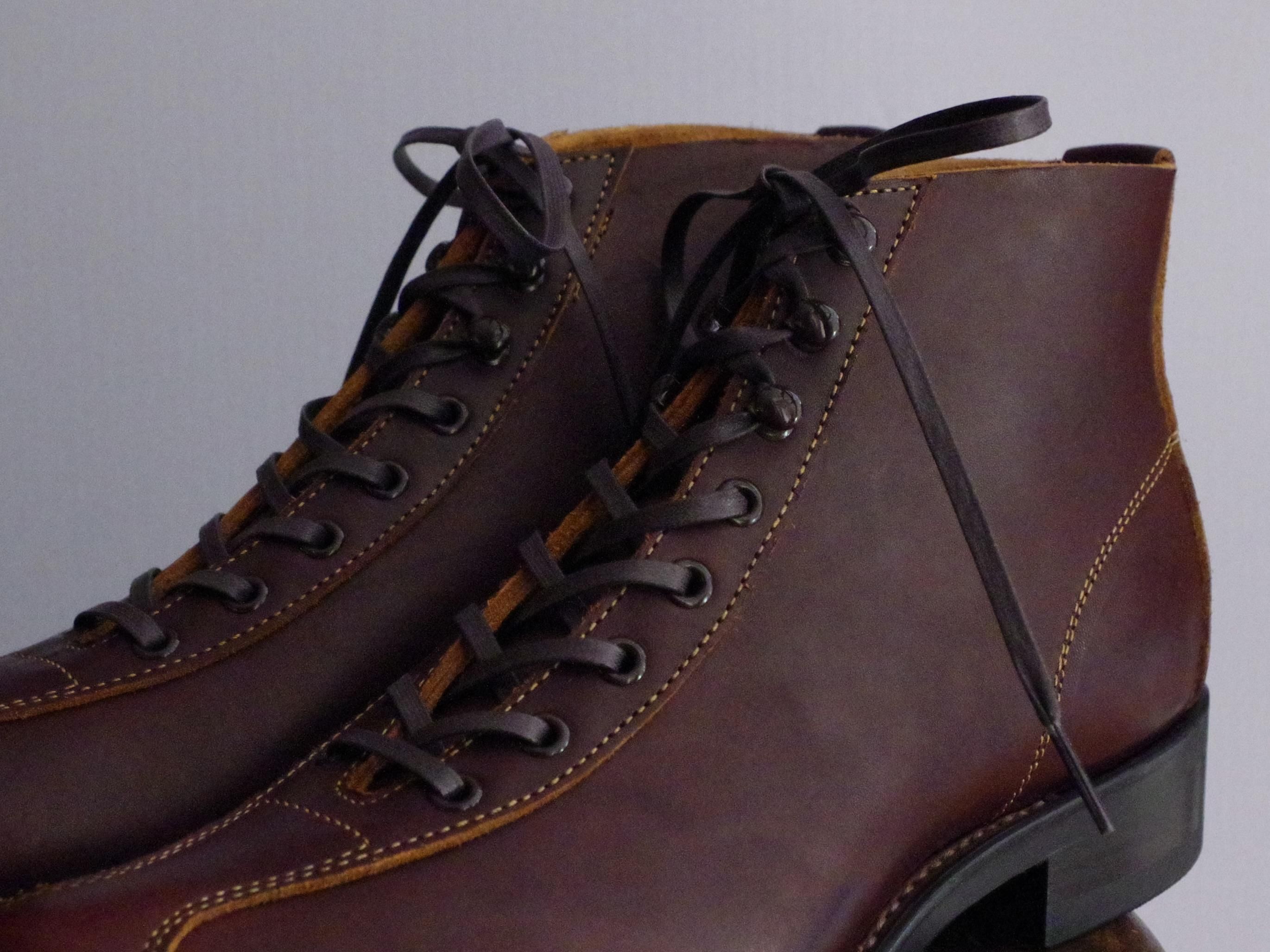 このブーツは、サイドをそれぞれ一枚の革パーツで作り、つま先とカカトで縫い合わせてセンターに紐通しからキャップへ続く革パーツを取り付けた構造となっています。