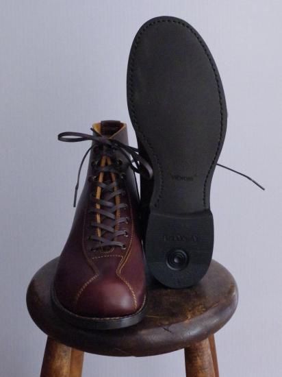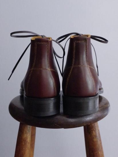 しっとりした肌と、フルアニリン(染料のみで染めた)レザーならではの透明感を持ち、履き込むと深まる色の陰影と色がフェイドして浮き上がるように出る茶芯で、味わい深い経年変化をします。