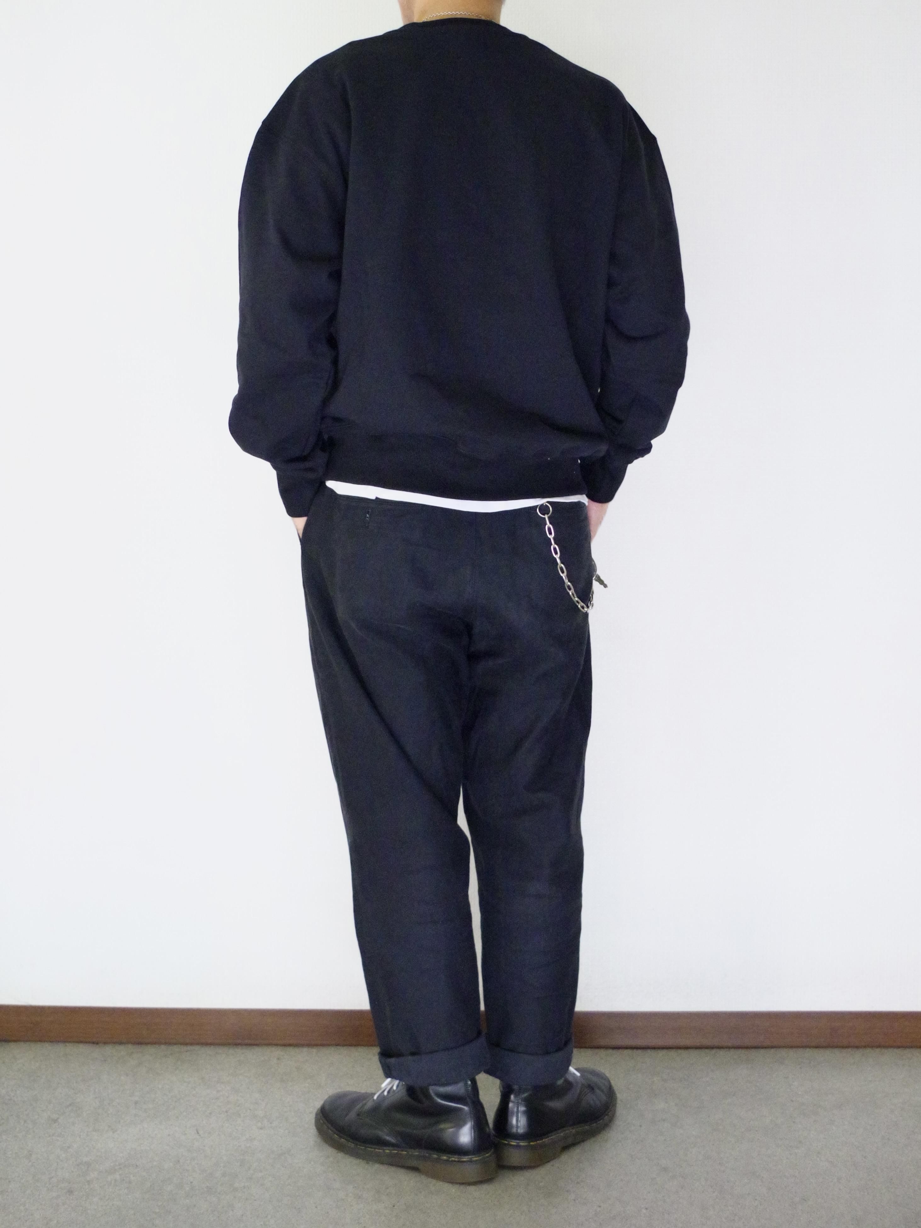 ボディには14ozヘビウェイトの綿100%裏毛素材を使ったオリジナルクルーネックスウェットを使用。