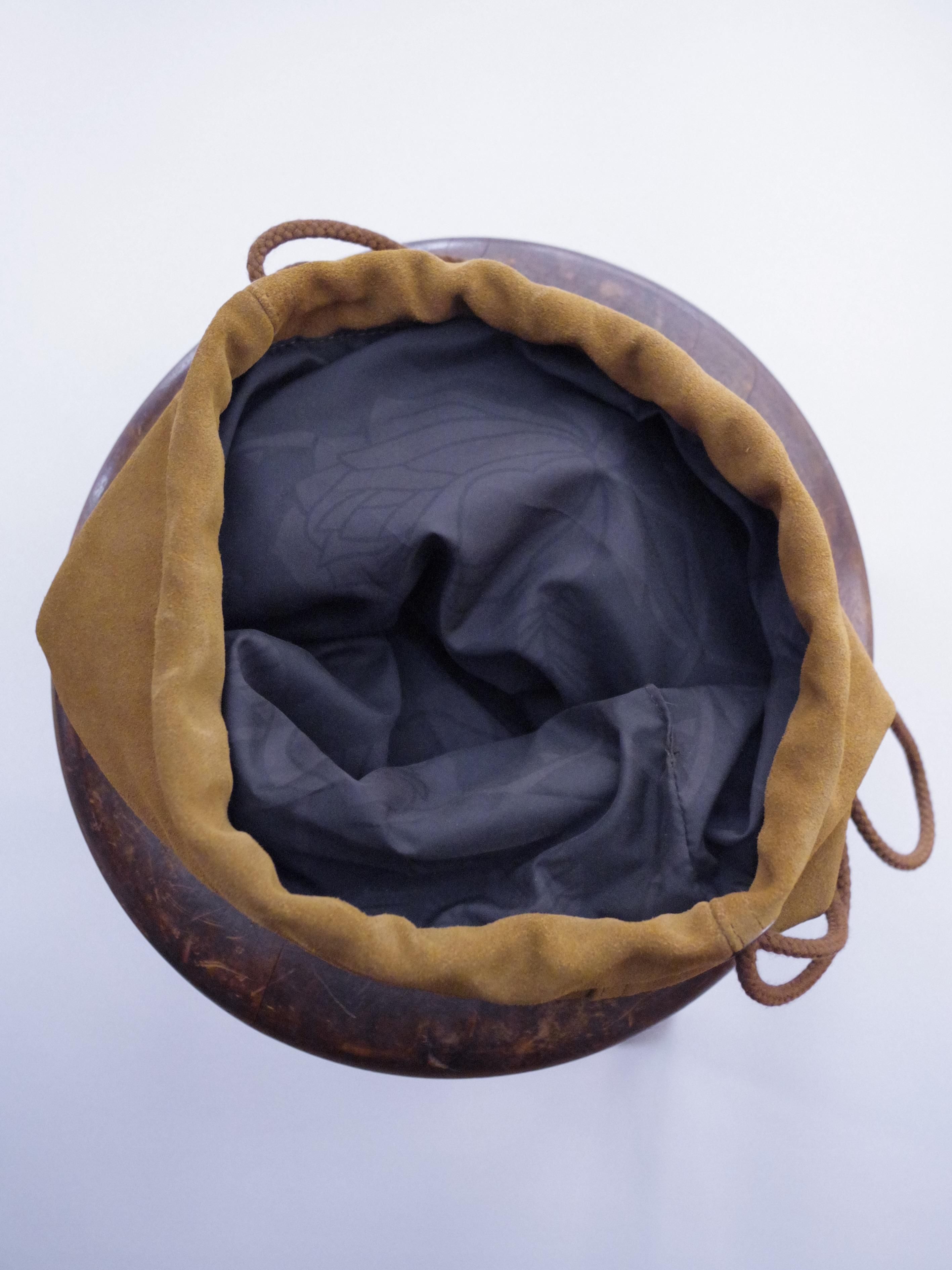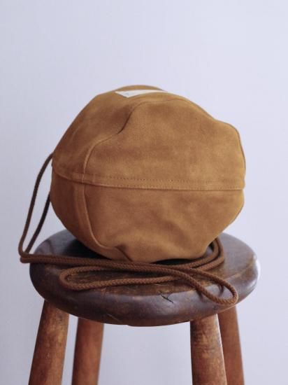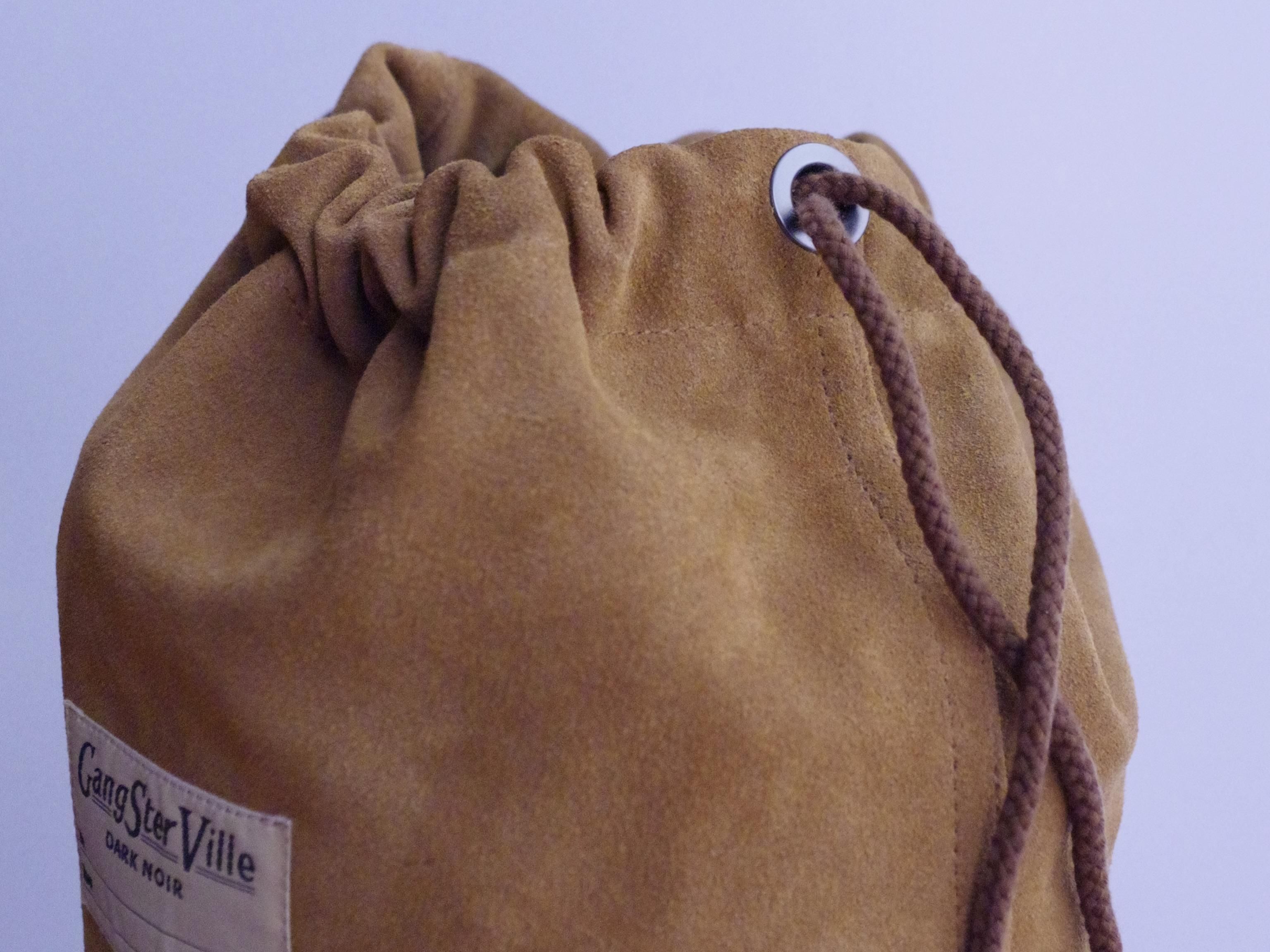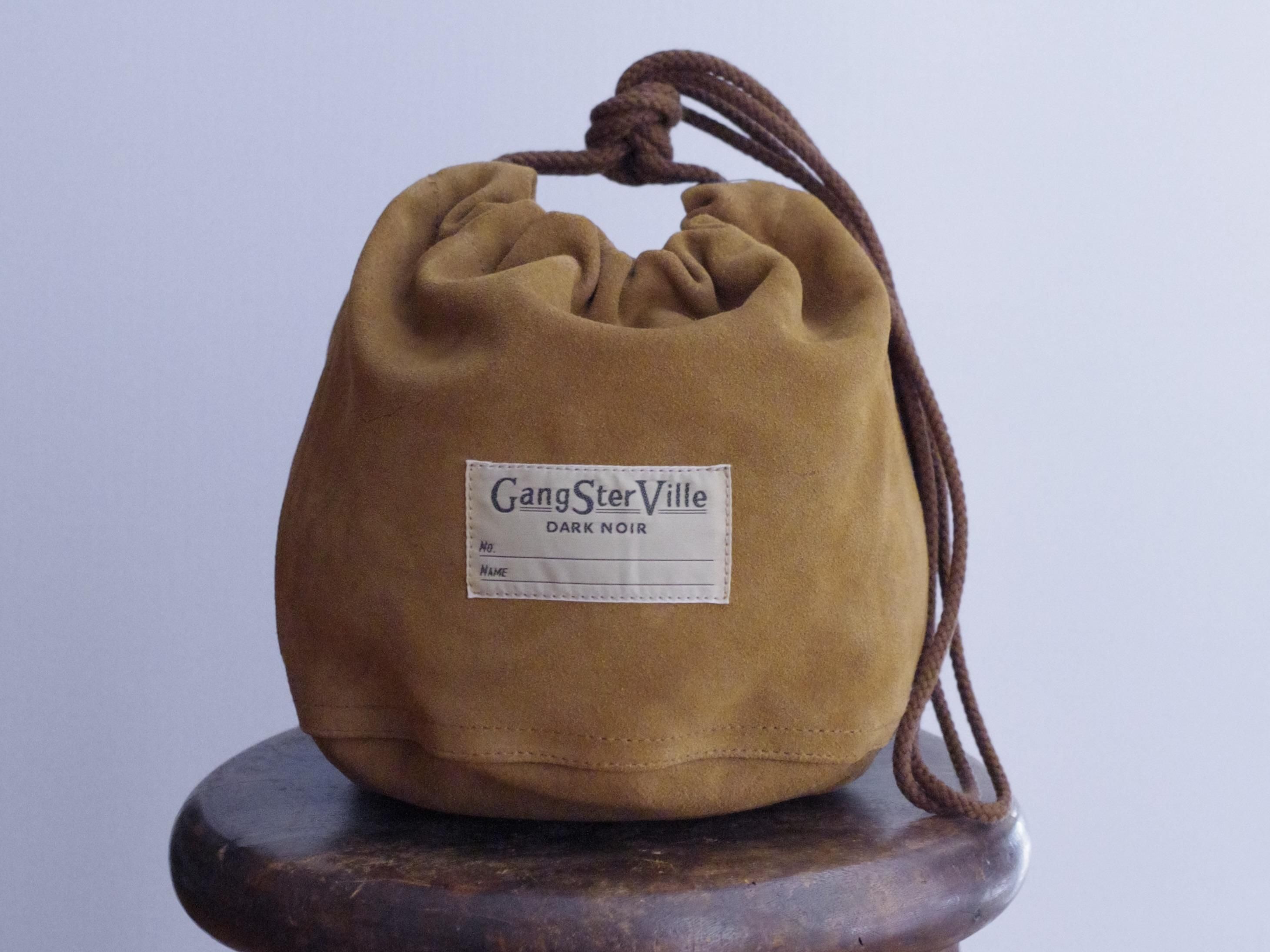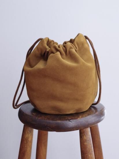 温かみのある表情が特徴で、柔軟性に優れたスウェードレザーで作成された巾着タイプのバッグです。