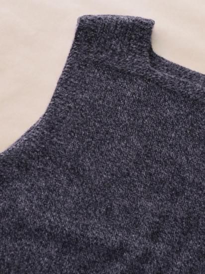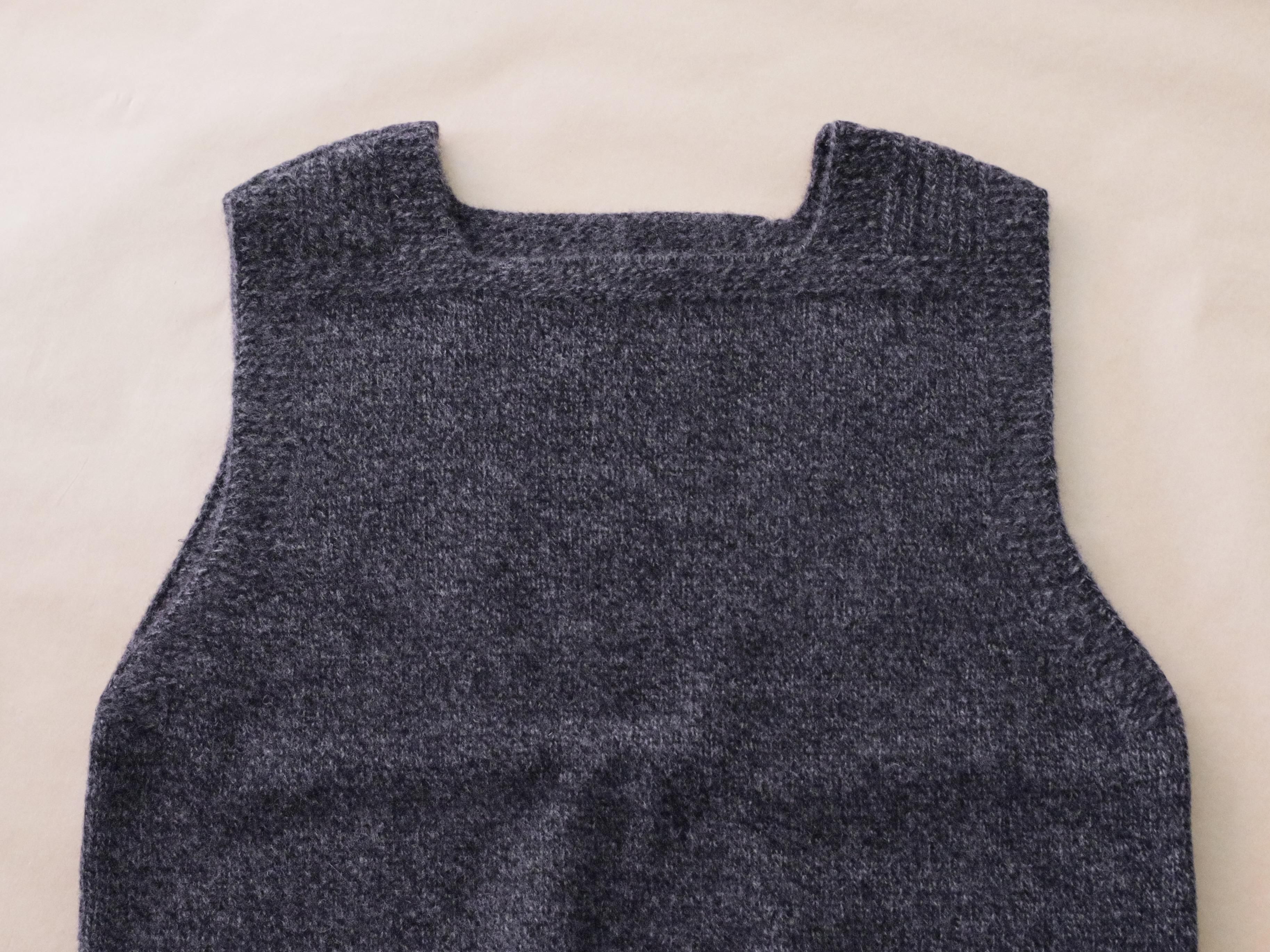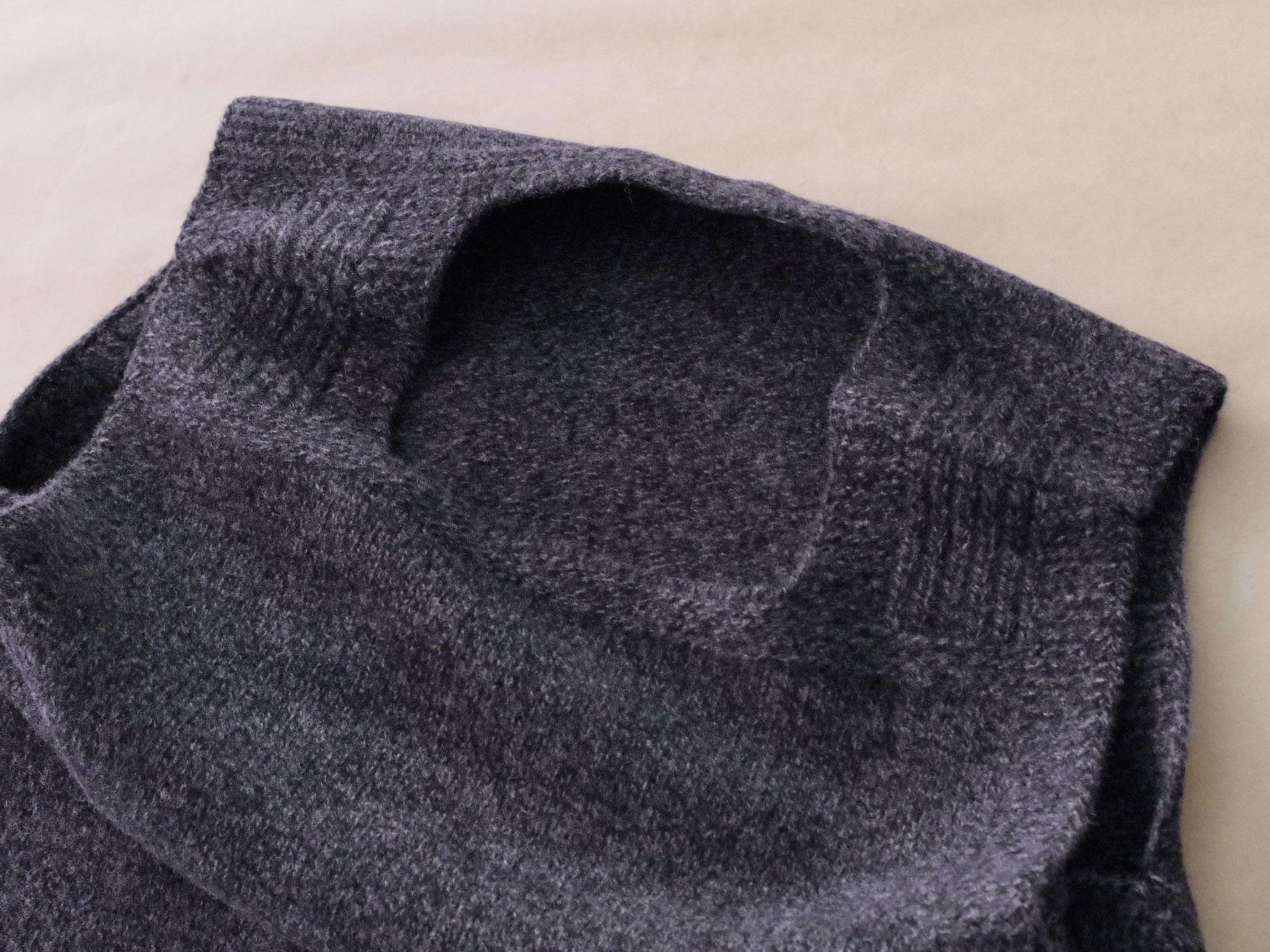 襟周りやアームホールの変則的な編地が特徴的な一着。2/16番の上質なウールを選定して、5ゲージで編み立て仕上げられています。