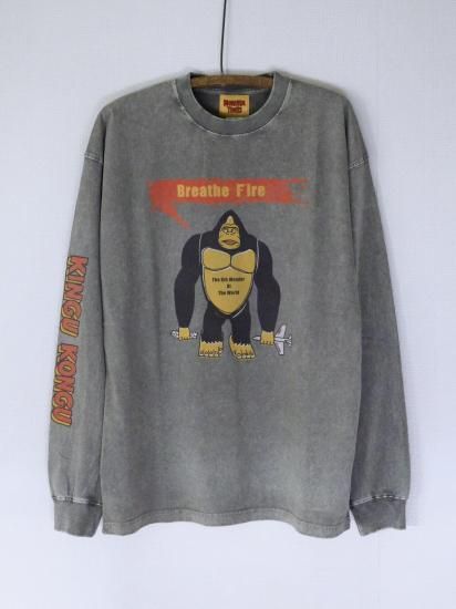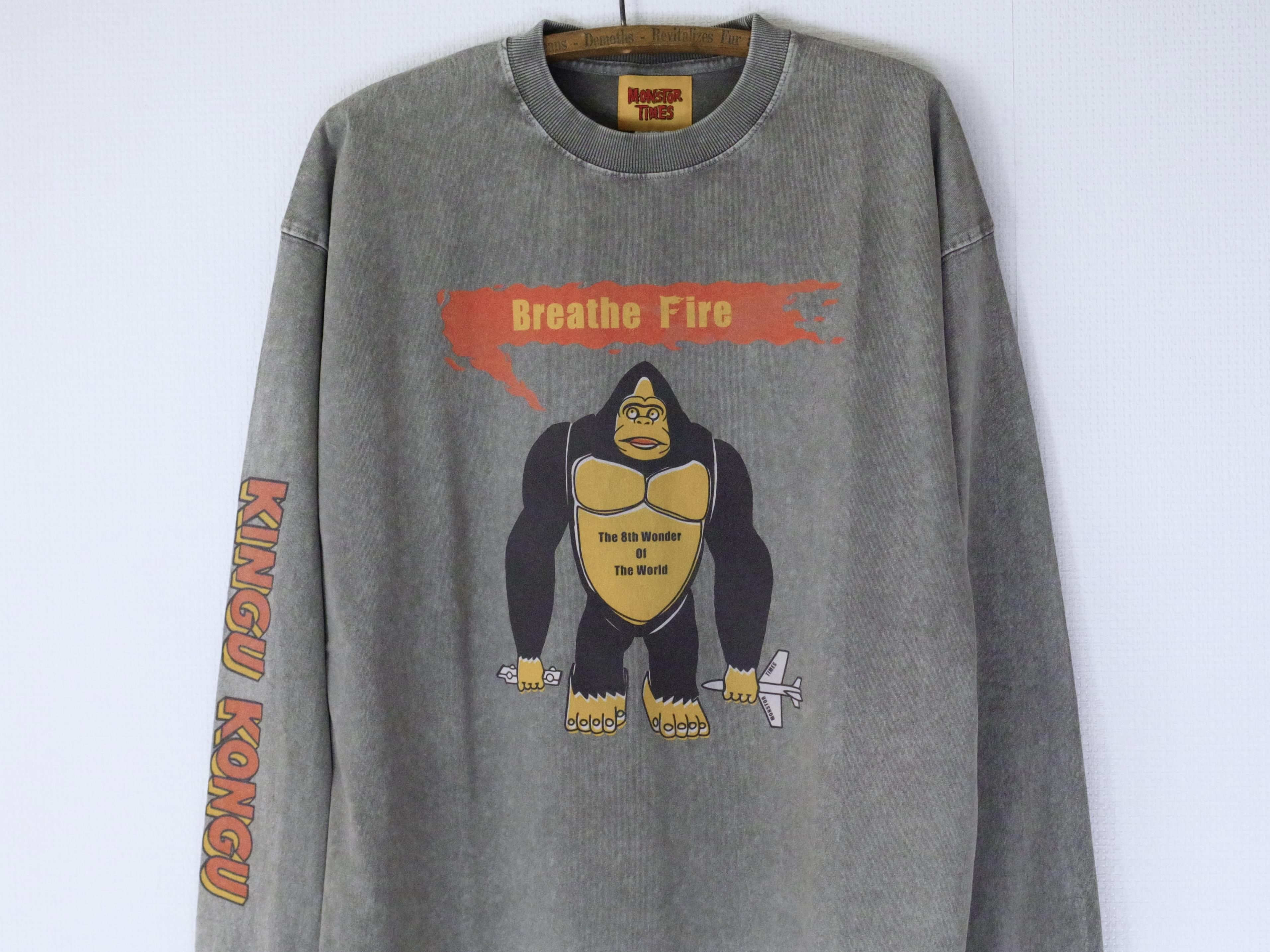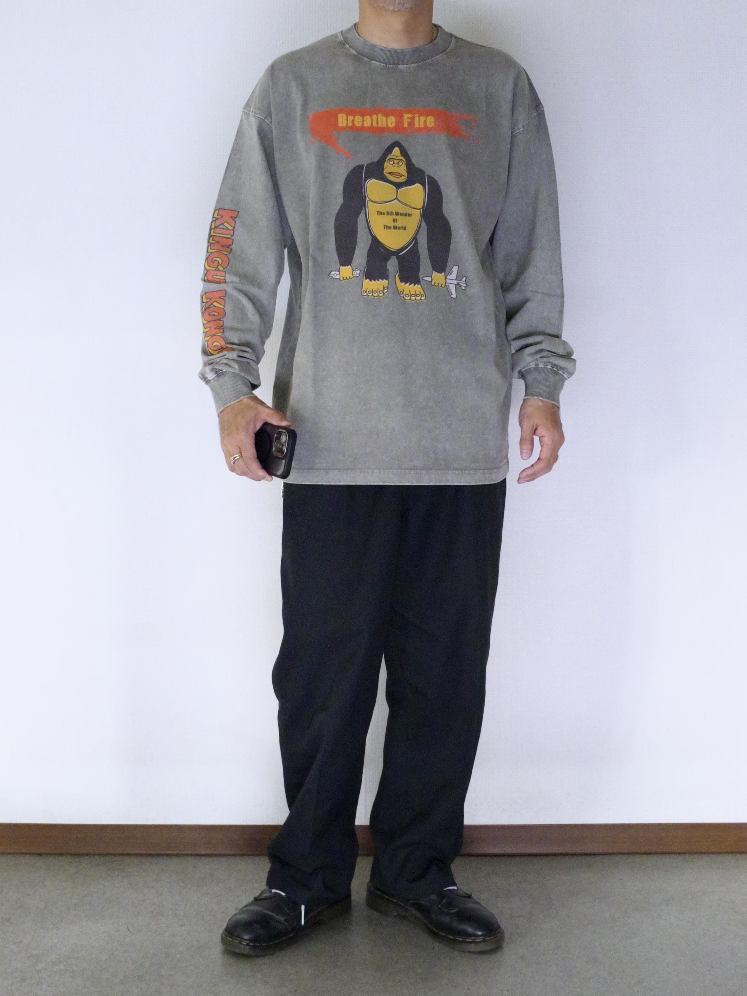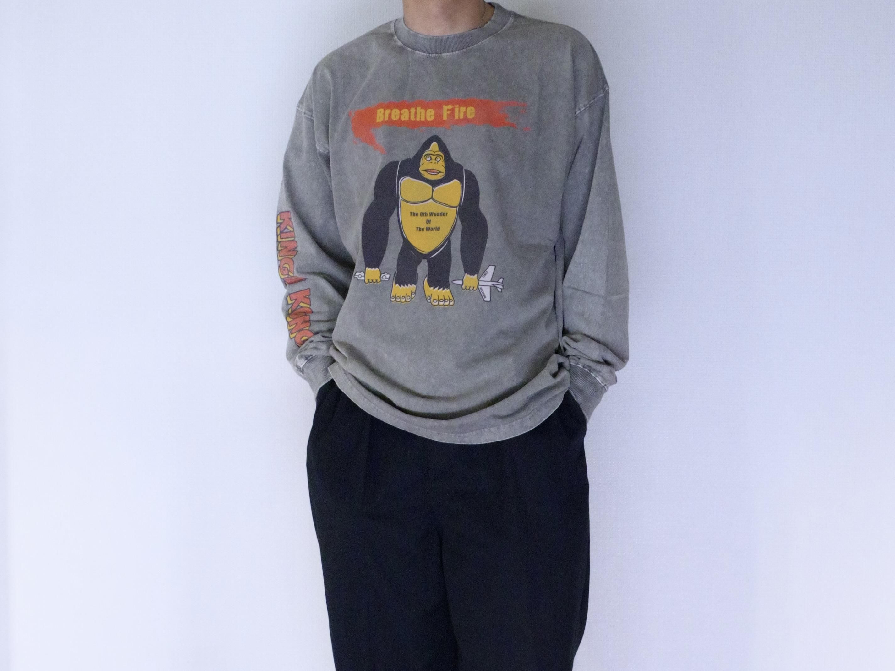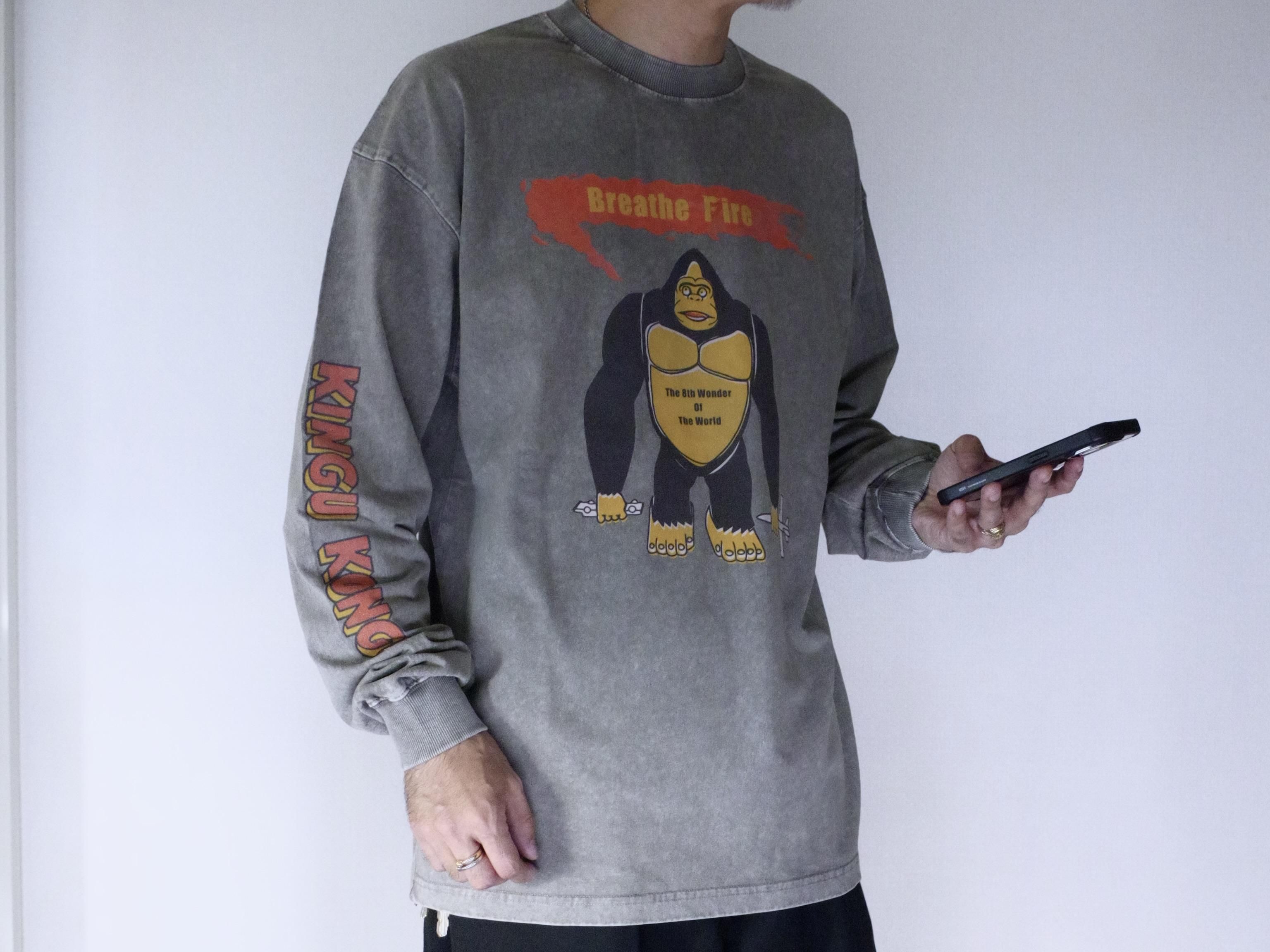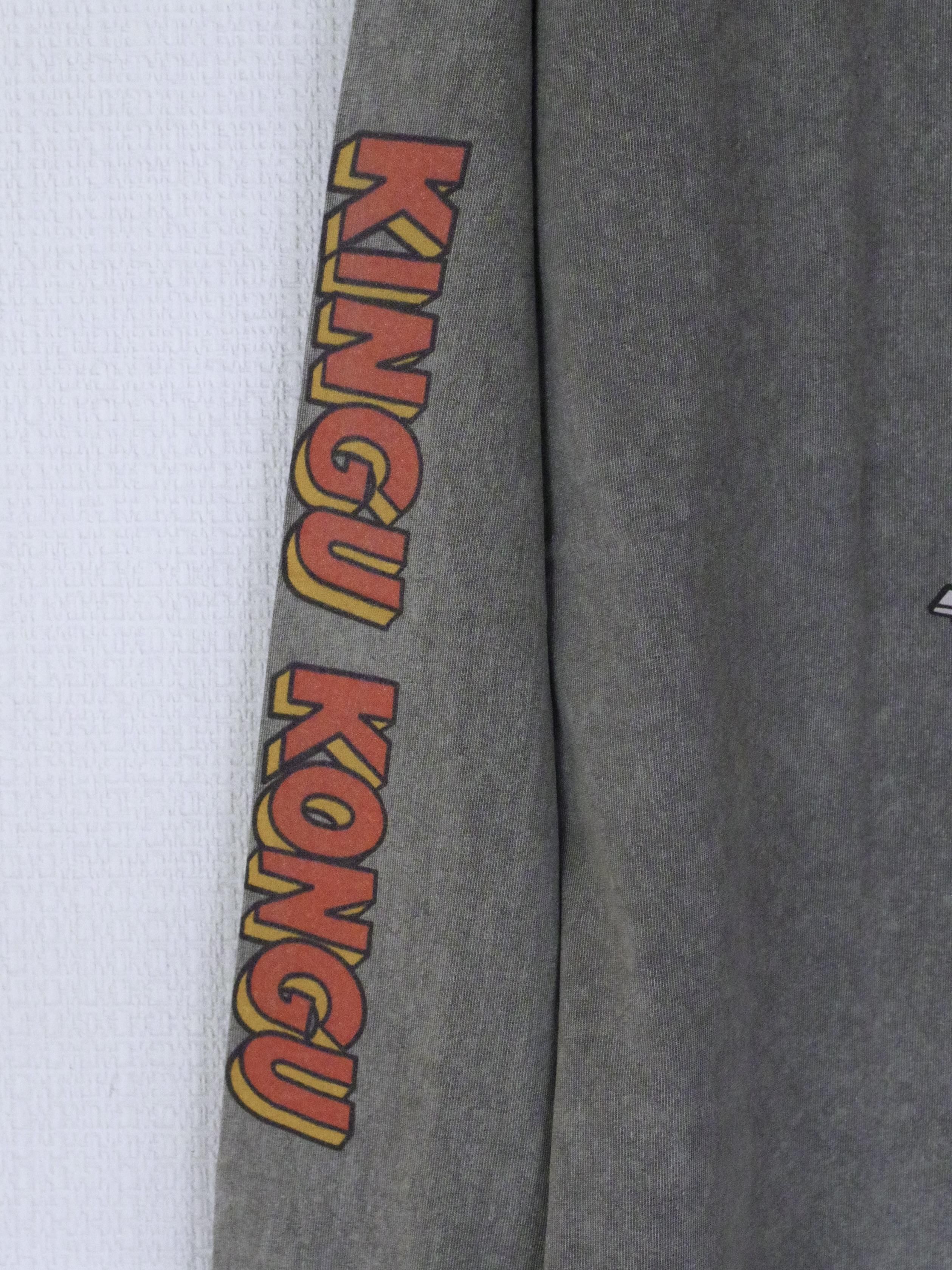彼をフロントデザインに落とし込み、袖プリントを”KINGU KONGU”としたのは、昔の日本ではよくあったスペルミスをあえて採用しています。
