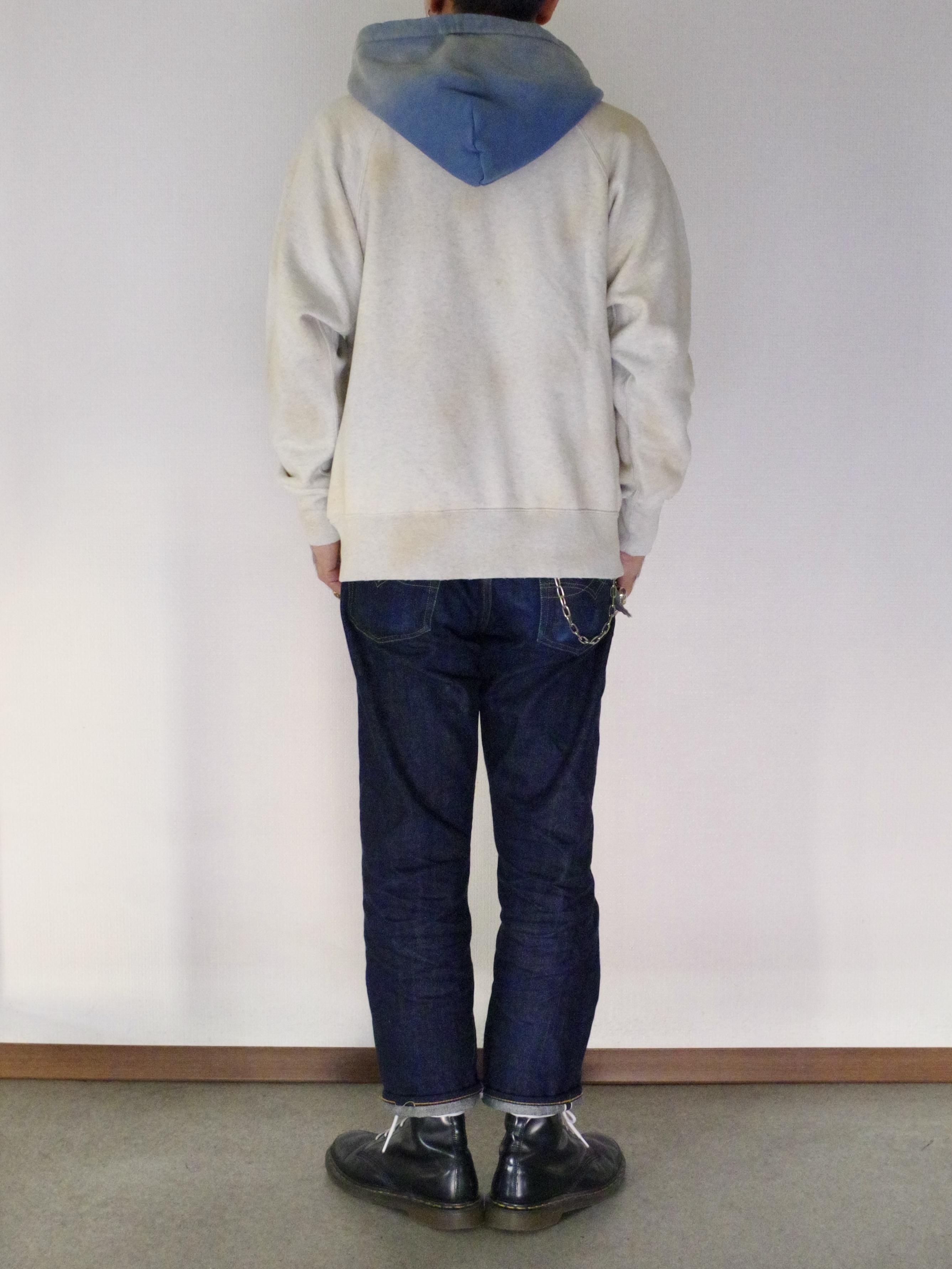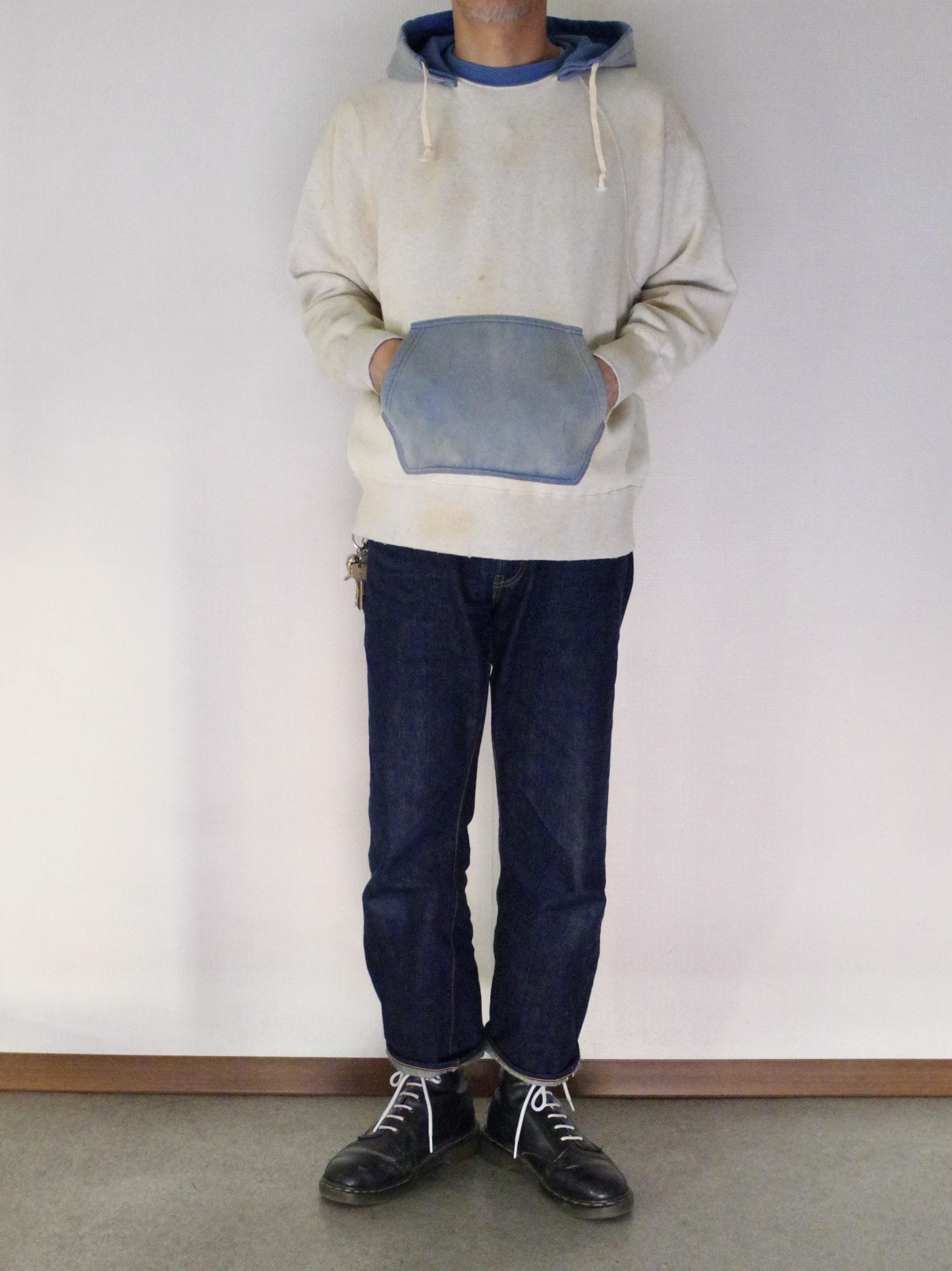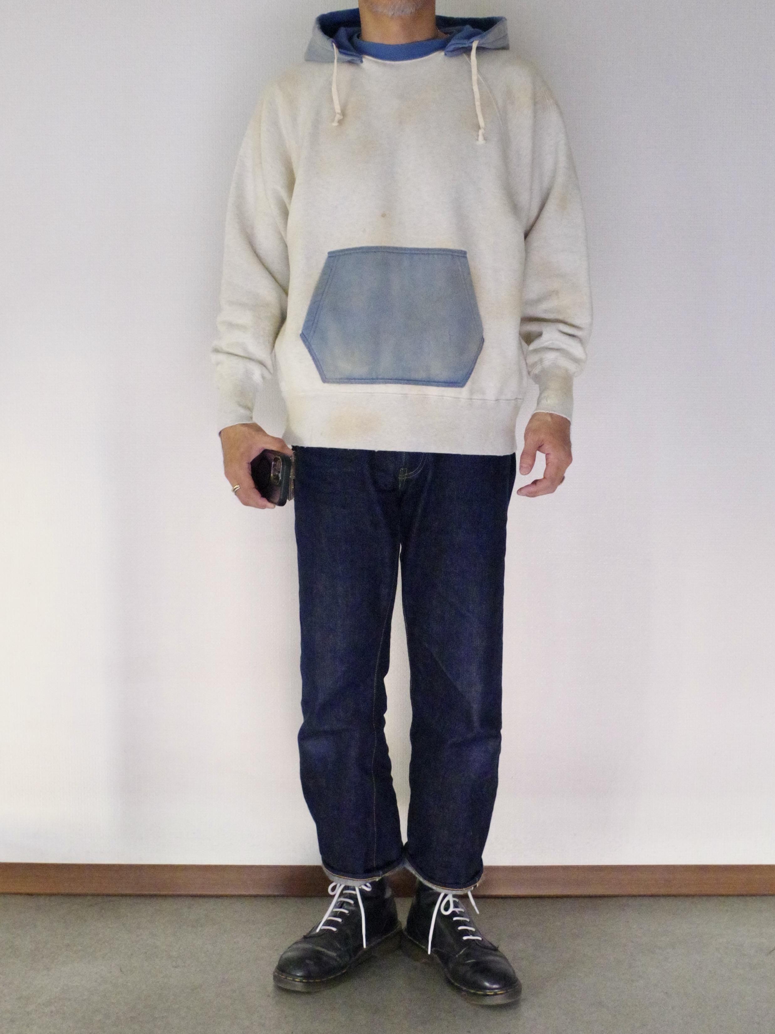 ヴィンテージAKOMのフリーダムスリーブスウェットをイメージし、ヴィンテージのものより少し着丈と裄丈を伸ばしリプロダクト。スウェットではミドルオンスの10.7oz。縫製糸は綿糸を使用しており、染めは経年変化が楽しめる硫化染めとなります。